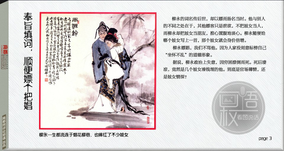 南都网文称,“柳永嫖娼,我们不骂他。因为人家没刻意标榜自己‘坐怀不乱’的道德形象”;并称“似乎人们不再相信把日子端起来过那一套”。