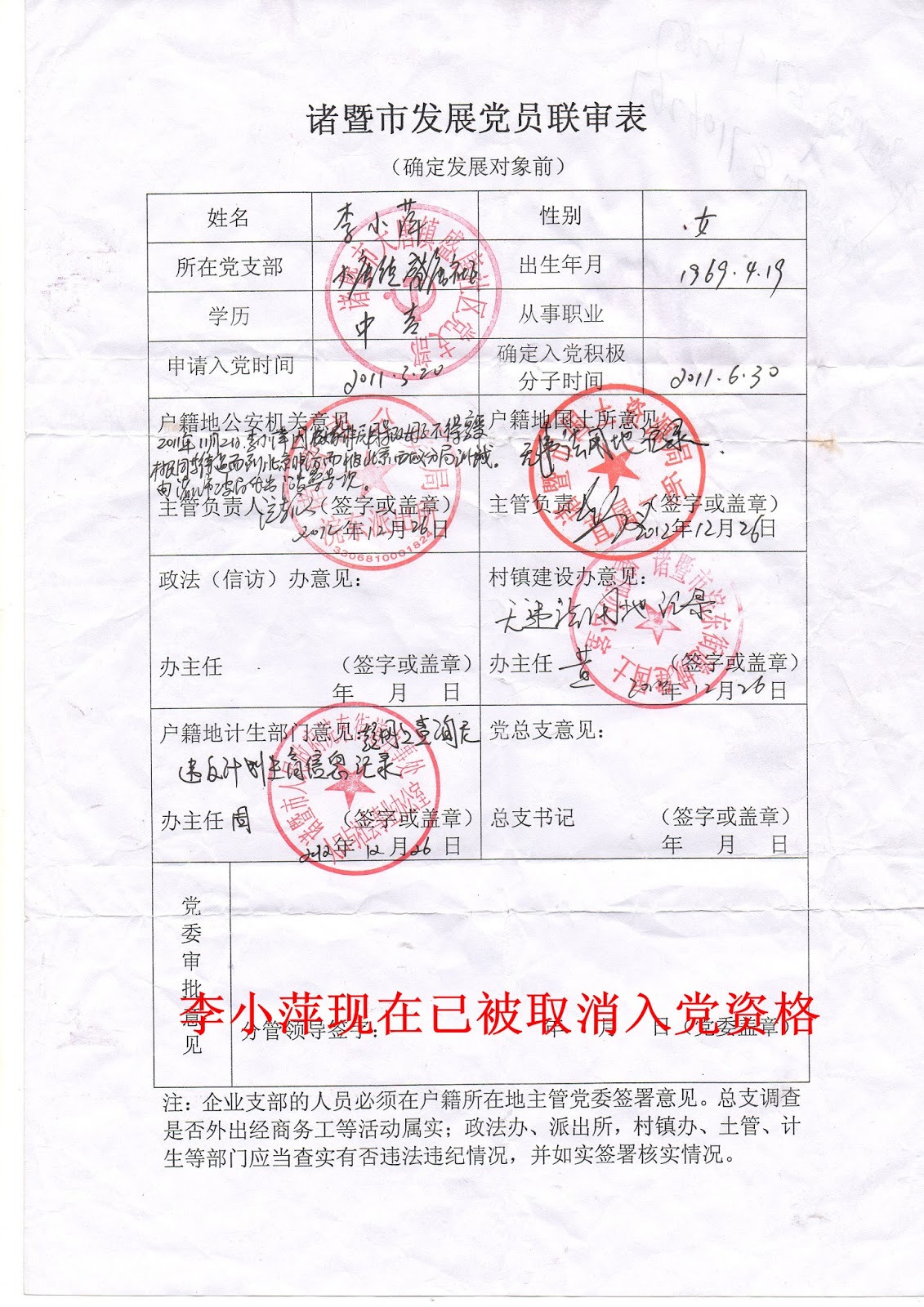 (维权网信息员黄天怒报道)浙江省诸暨市浣东街道城东村村民李小萍是一位义女。2007年3月她与前夫宣松火曾因故离婚。2008年宣松火因医疗事故致残,医方推卸责任,法院包庇医方,两次判宣松火败诉,李小萍在现男友的支持下,毅然决然地为前夫伸冤走上了上访申诉之路。李小萍原来是共产党发展的入党对象,因上访被取消了入党资格,并被当地政府送绍兴市精神病医院关押一个月。