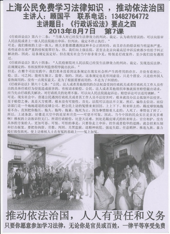 主讲人是上海法律工作者顾国平老师,主讲题目:《行政诉讼法》要点之八:若干问题的解释审理与判决。联系人是上海维权人士孙洪琴。但是,11时30分左右,当顾国平老师开始讲课时,出现便衣捣乱,导致讲课无法正常进行,被迫停止。