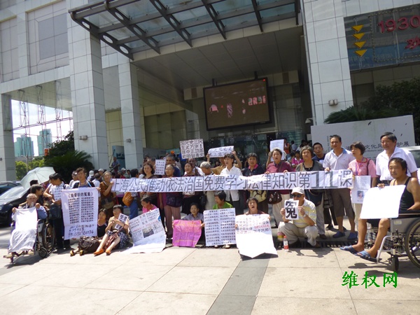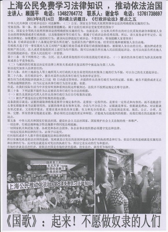 (维权网信息员雷鸣报道)9月4日中午11时许,丁菊英、唐建中等上海维权人士在人民公园广场上向民众散发第7课和第8课法律知识信息资料。