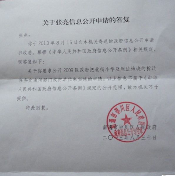 崇川区政府作出了《关于张亮信息公开申请的答复》,其签署日期为2013年8月30日,送达日期为9月4日。该《答复》称:“关于你要求公开2009年区政府把北街小学及周边地块的拆迁任务交由何部门或何单位实施的申请。以上信息不属于《中华人民共和国政府信息公开条例》规定的公开范围……故本机关不予提供。”