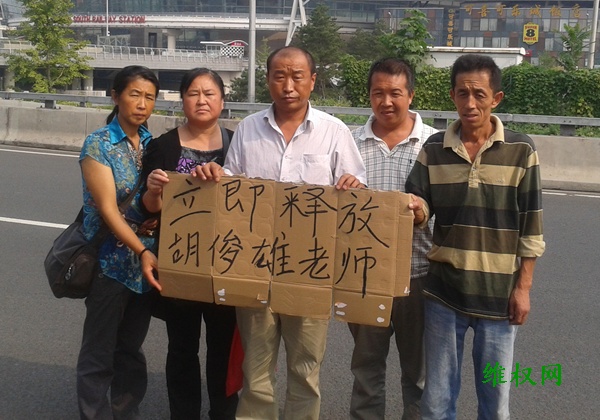 | 邓志波等人得知胡俊雄被抓后举牌抗议 |