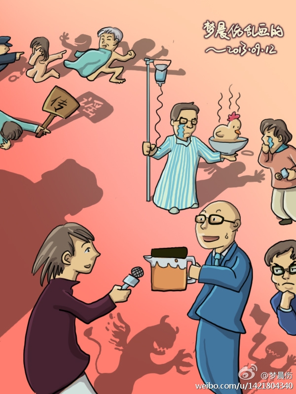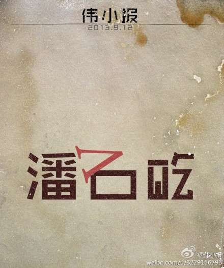 9月11日,知名房地产商、微博大V潘石屹接受央视专访谈“打击谣言”,他在长达15分钟的视频专访中表达了对网络谣言的不满,并且表达了对“两高解释建立规则”的支持。潘石屹这则访谈被不少网友认定是为官方政策背书,因此对他展开了猛烈批评,不过,潘在采访前、后发布了微博含蓄表达了自己遭受压力、言不由衷的情况,并自嘲具有“资产阶级软弱性”。有网友从采访中找出潘石屹言谈口吃、坐姿别扭的画面加以调侃,还有网友对这样的“尴尬表演”发表感叹:在墙面前,鸡蛋不但可能被击碎,还可能被剥光蛋壳,任意羞辱。