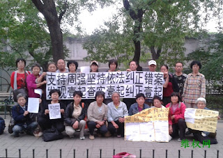来自辽宁的贾凤琴、王福全、刘广兰,天津的郑建慧、戴秀英、张文艳、钱长永、李象荣、郑光泉,山东林秀丽,河南的李玉凤,河北段淑兰、杨乃如,内蒙杨金芝,湖北屈志英、刘乐保,黑龙江孙喜善等人,打出“盼望周强院长言之有信、说到做到、不负众望!”和“支持周强院长,坚持依法纠正错案,发现一起,查实一起。纠正一起!”的横幅,要求最高法院依法纠正错案。