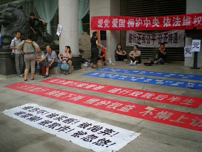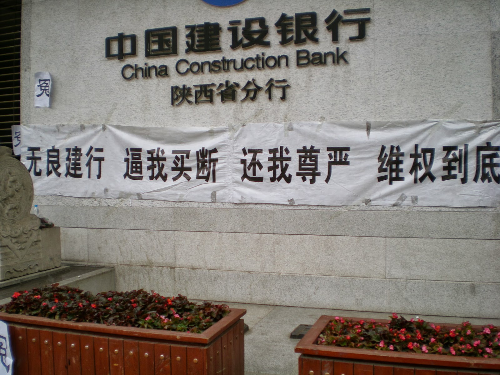 (维权网信息员于富民报道)建设银行陕西分行买断员工的上访已持续近十年了,无论是陕西分行还是全国总行,对他们提出的问题都不予解决。今2013年6月13日,他们集体到陕西分行上访,分行领导指使保安,砸坏他们的汽车。9月16日、17日,他们连续两天到陕西分行请愿,17日上午,有十多个警察到现场殴打、驱赶他们,但是他们坚持给警察摆事实讲道理,斥退了警察。
