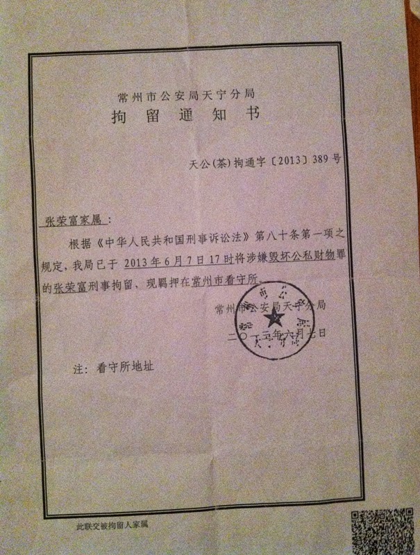 张荣富的妻子一再要求常州市公安局天宁分局茶山派出所出具刑拘的法律文书。该派出所于2013年7月24日才向张荣富的妻子出具了《常州市公安局天宁分局(天公(茶)拘通字【2013】389号)拘留通知书》称,我局将涉嫌毁坏公私财物罪的张荣富刑事拘留。但该《拘留通知书》不是原件,而是复印件;且在拘留决定之日起一个半月后才其家属领取《拘留通知书》复印件。