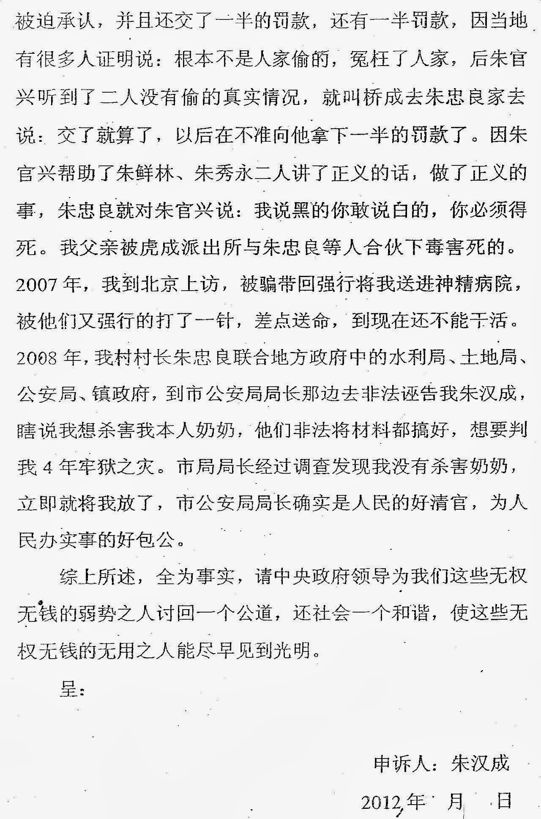 现在朱汉成名义上是在北京上访,但为了保全性命,他不敢去任何信访单位,因为一旦再被抓,他已经没有能力再逃出来。