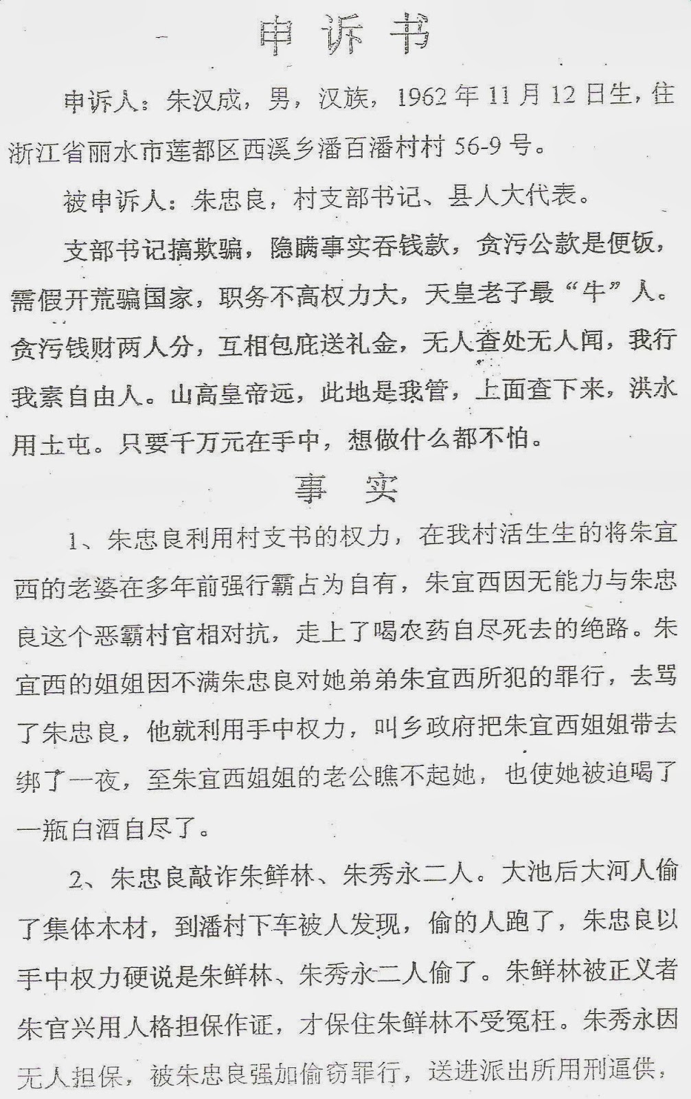 (维权网信息员柴民报道)朱汉成是浙江丽水花都区人,因为父亲被毒害致死到北京上访多年无果,多年的奔走呼号不但父亲的冤没申,他自己还险遭毒手丧命。