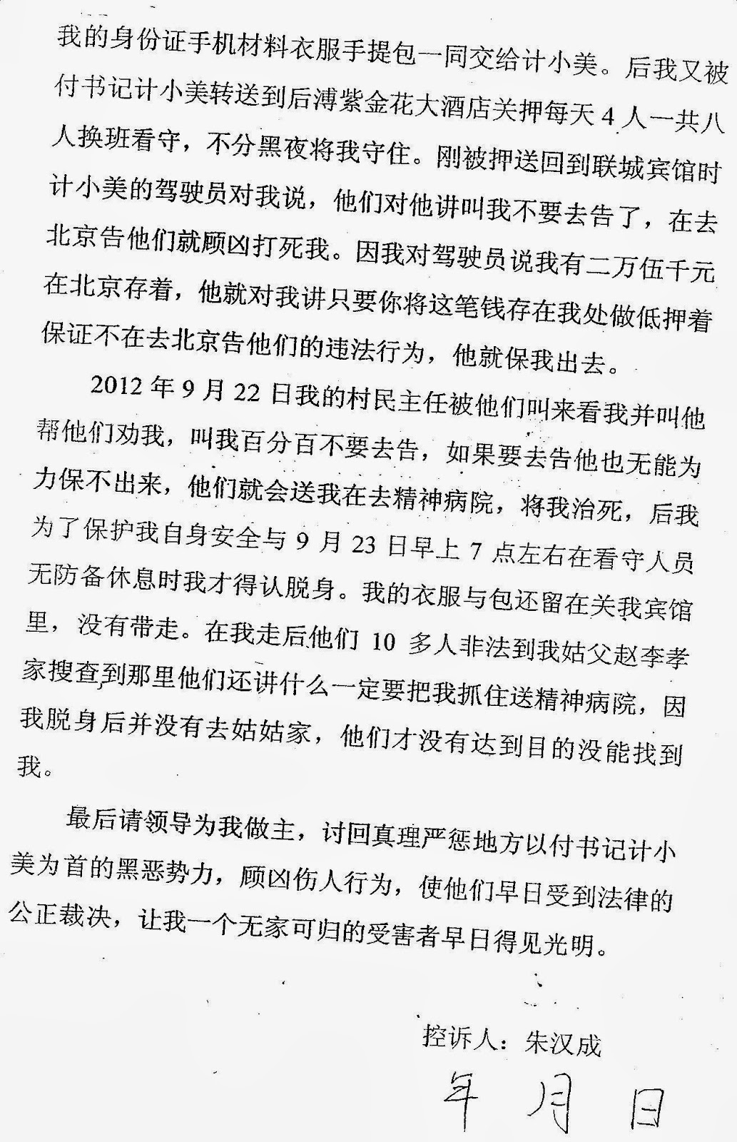 2012年9月18日,他又一次被镇副书记兼维稳办主任纪小美派人抓了回去,这次不但还要把他关进精神病院,而且还扬言要弄死他。为了保命,他趁看守大睡的时候只身逃了出来,在他逃离的时候,纪小美已经和精神病院签好了“治疗”朱汉成的合同。至此朱成汉再也没敢回到家中。