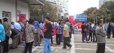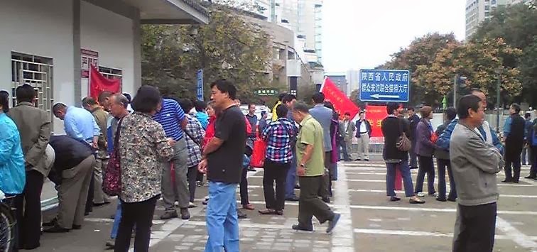 (维权网信息员李军报道)2013年9月24日,星期二,秋风瑟瑟,数百名原襄渝铁路的建设者,当年的未成年人、三线学兵连老兵聚集在陕西省信访局门口请愿维权,争取权益公平,要求政府落实相关待遇,抗议政府对老兵诉求长期无回复不解决。在现场的三线学兵连老兵还争相收藏画家、战友杨米贵的长卷《情系襄渝线》。