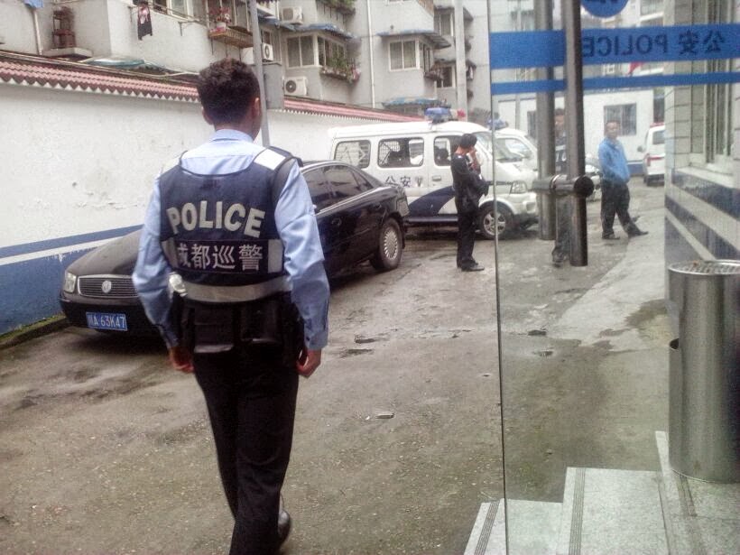 (维权网信息员李红报道)刚刚旅游回家的“链子门”受害人幸清贤,继2013年9月25日被限制自由在家后,今天继续向本网信息员控诉:2013年9月26日下午1点40左右,幸清贤出门打算去北巷子派出所拿办理的“暂住证”,出大门口,就发现一辆警车停在门外,一伙不明身份的人见到幸清贤走出大门,立即下警车对幸清贤实施跟踪,并立即打电话通知什么人,在不远处,一辆110巡警车辆就停在那里,里面坐着一个女警察和北巷子派出所警官刘顺东,幸清贤走到花牌坊街时,辖区户籍民警万波骑电瓶车撵上来,询问幸清贤要到哪里去,幸清贤告诉他要去派出所,他说正好,并命令跟踪的不明身份的人贴身跟踪