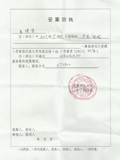 2点50左右,警号为008517的警察开始给幸清贤做笔录,警察万波来告诉他做完笔录必须幸清贤离开,他们还要继续做北京的笔录。做完询问笔录后,幸清贤要求给受案回执,经请示,给出了一份“受案回执”但受案回执上没有接受报案的警察姓名,明显是违反规定的。