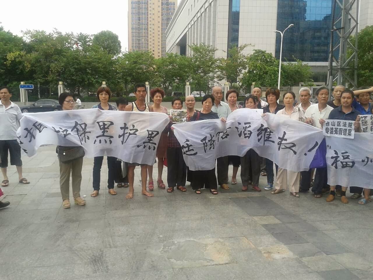 今天在法庭内外,许多国保,便衣以及法院的法警和保安都在严阵以待,更加让人不解的是福州各区镇、街道维稳官员也都带人守候法院外保卫。期间不时出现抢夺举牌冤民状布情况,但因来声援的冤民众多,基本没得逞!