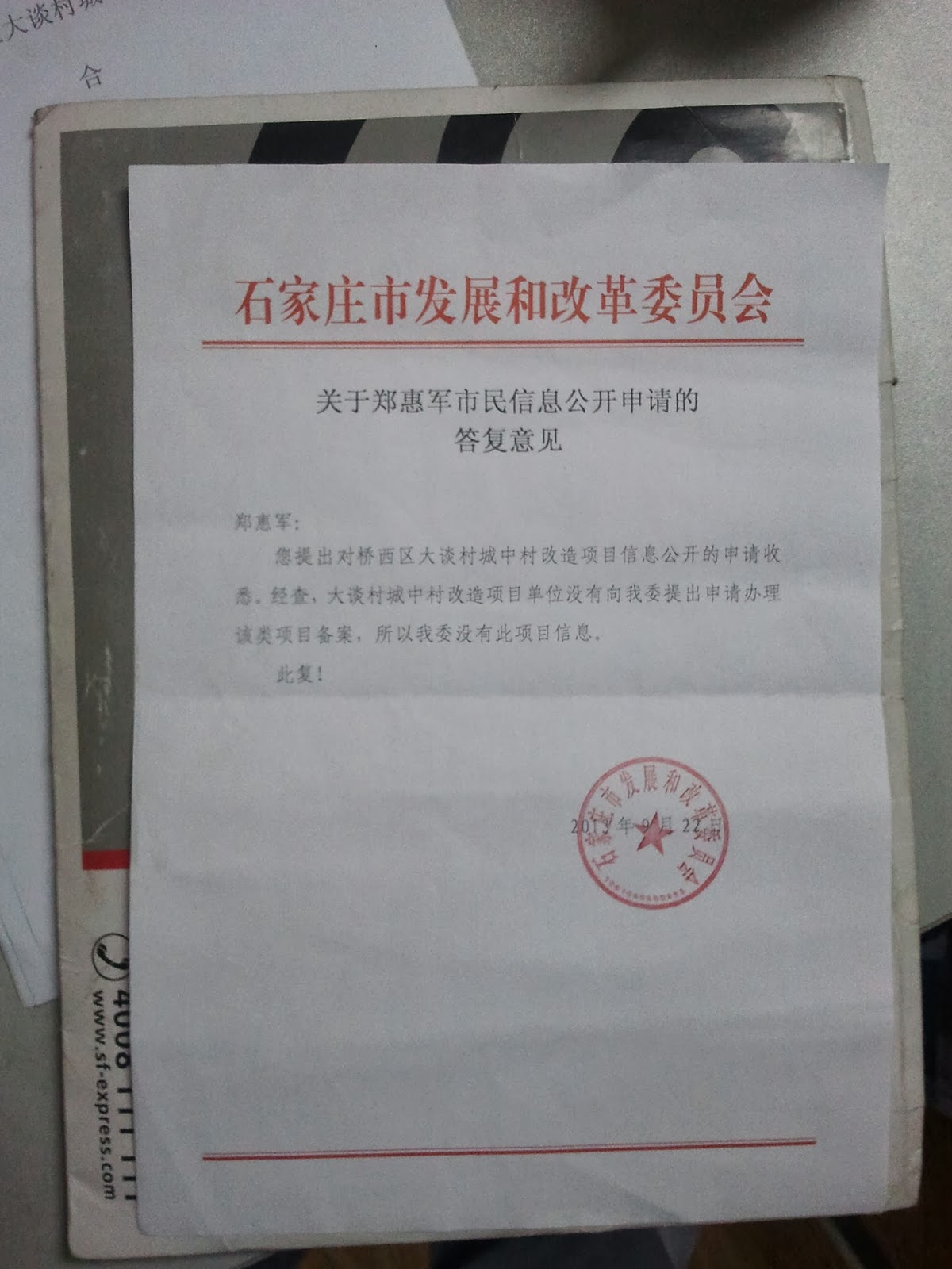 于是,郑惠军开始通过信息公开,了解这次拆迁的合法性,发改委答复,没有立项信息,规划局答复没有规划信息,国土局答复:没有征地批文信息,区政府答复,没有招投标信息,财政局答复没有拆迁补偿款资金到位情况信息。
