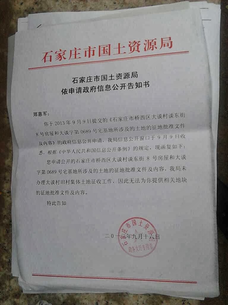 同时附上了三个文件:1、《石家庄城中村改造领导小组办公室关于将桥西区大谈村列入城中村改造计划的批复》2、《石家庄桥西区大谈村城中村拆迁改造补偿安置方案》3、《石家庄桥西区大谈村城中村拆迁改造补偿安置修改补充方案》但这三个文件均无公章。