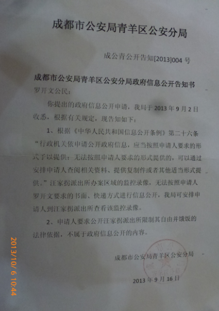 9月16日,青羊区公安分局对他的信息公开作出答复,同意他去汪家拐派出所查看监控录像,但不许他复制录像,对于他要求的执法依据,则以不属于信息公开内容为由不予公开。