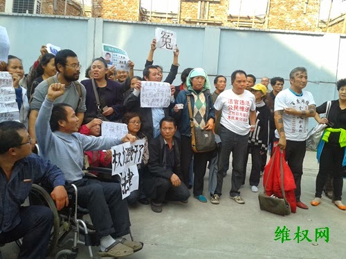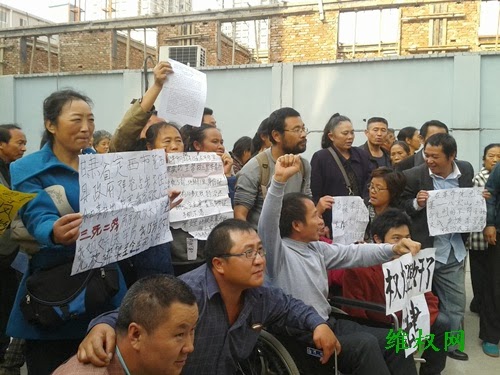 下午一点半左右,一百多名各地维权访民和网友,聚集在法院院内等候开庭。部分人已经办理旁听手续。82岁的王秀英老人和女儿乘出租车赶到法院,著名的维权律师李柏光在大厅里等候。一反常态法院对参加旁听的人迟迟不做安检。两点多钟,却传来消息:今天不开庭了。