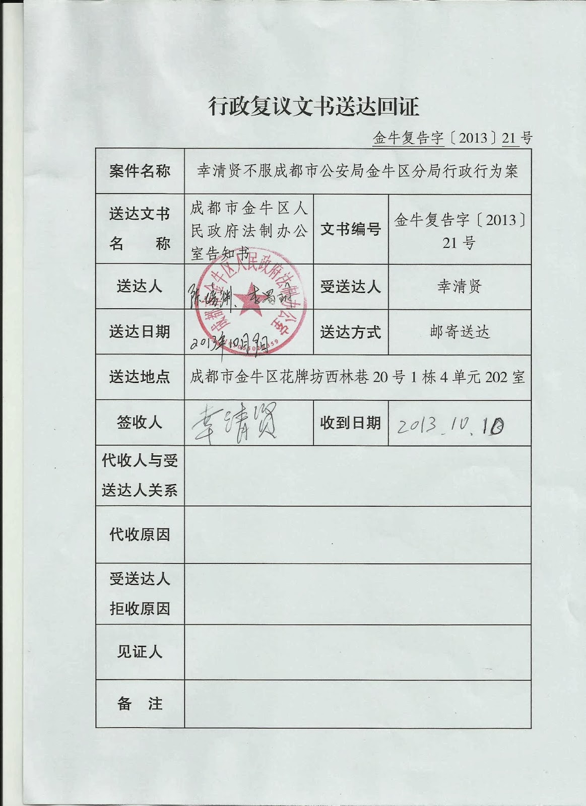 同时,幸清贤又向金牛区法院提交了行政诉讼状,就金牛区公安局限制其人身自由的行为,要求法院确认其违法。