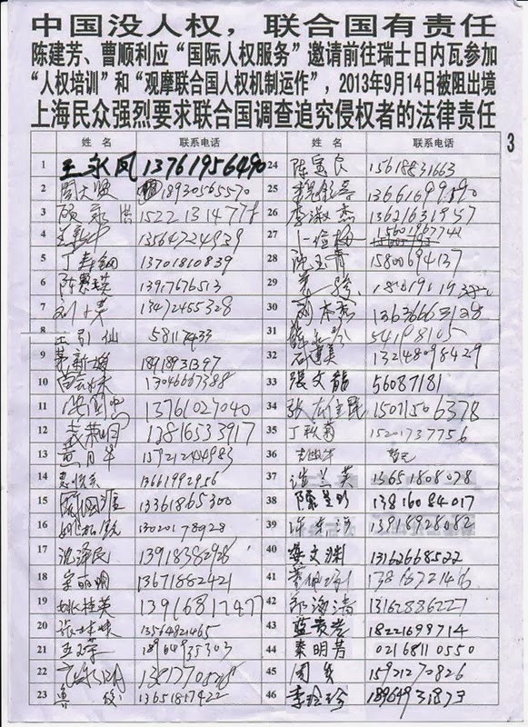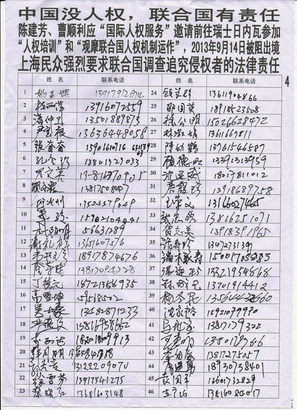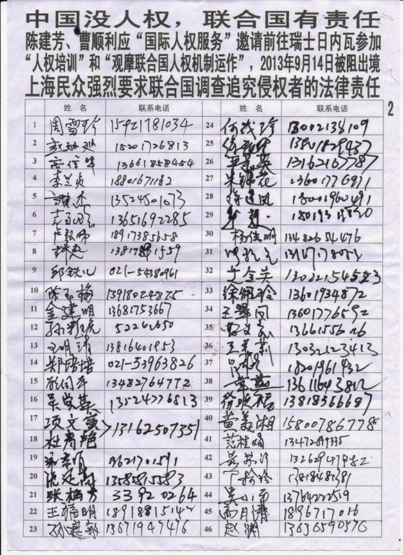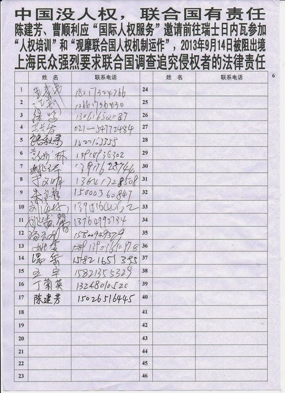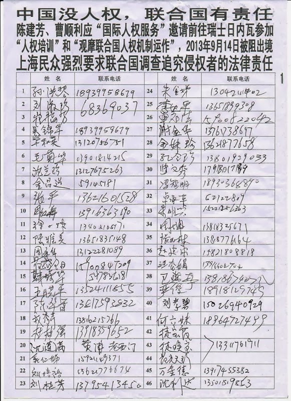 上海235名维权民众强烈要求中共当局立即还曹顺利人身自由,放行曹顺利和陈建芳等人权捍卫者去联合国参加旁听10月22日对中国的普遍定期审议。