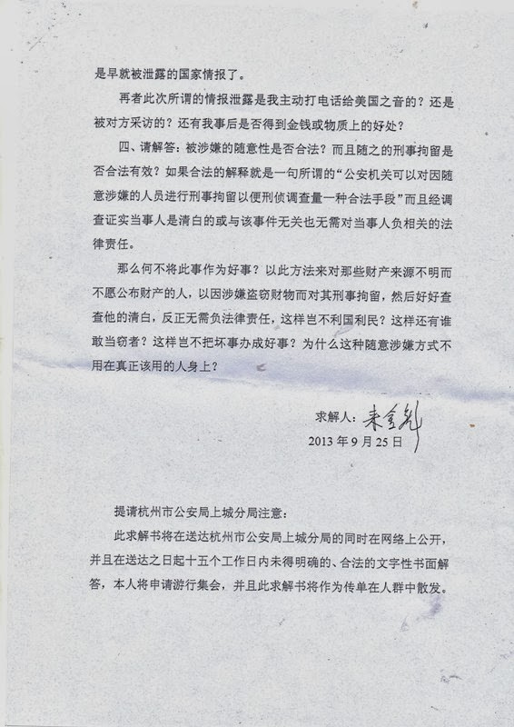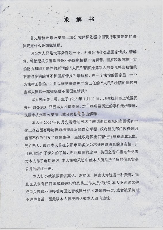 事件发生后,中国民主党人、民间环保团体“绿色观察”成员来金彪到东阳画水镇了解情况,并接受了美国之音的采访。来金彪回到杭州后,被杭州市公安局上城分局国保大队以“泄露国家情报罪”刑事拘留一个月,称来金彪向美国之音介绍画水镇村民维权是“泄露国家情报”。对此,来金彪表示不解。在认真学习了国家有关法律法规后,来金彪于2013年10月10日向上城区公安分局递交了《求解书》,要求该公安机关解释何为“国家情报”,他当年向美国之音介绍画水事件是否构成“泄露国家情报罪”。如果罪名不成立,他要求当局向他公开道歉并申请国家赔偿。