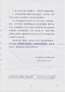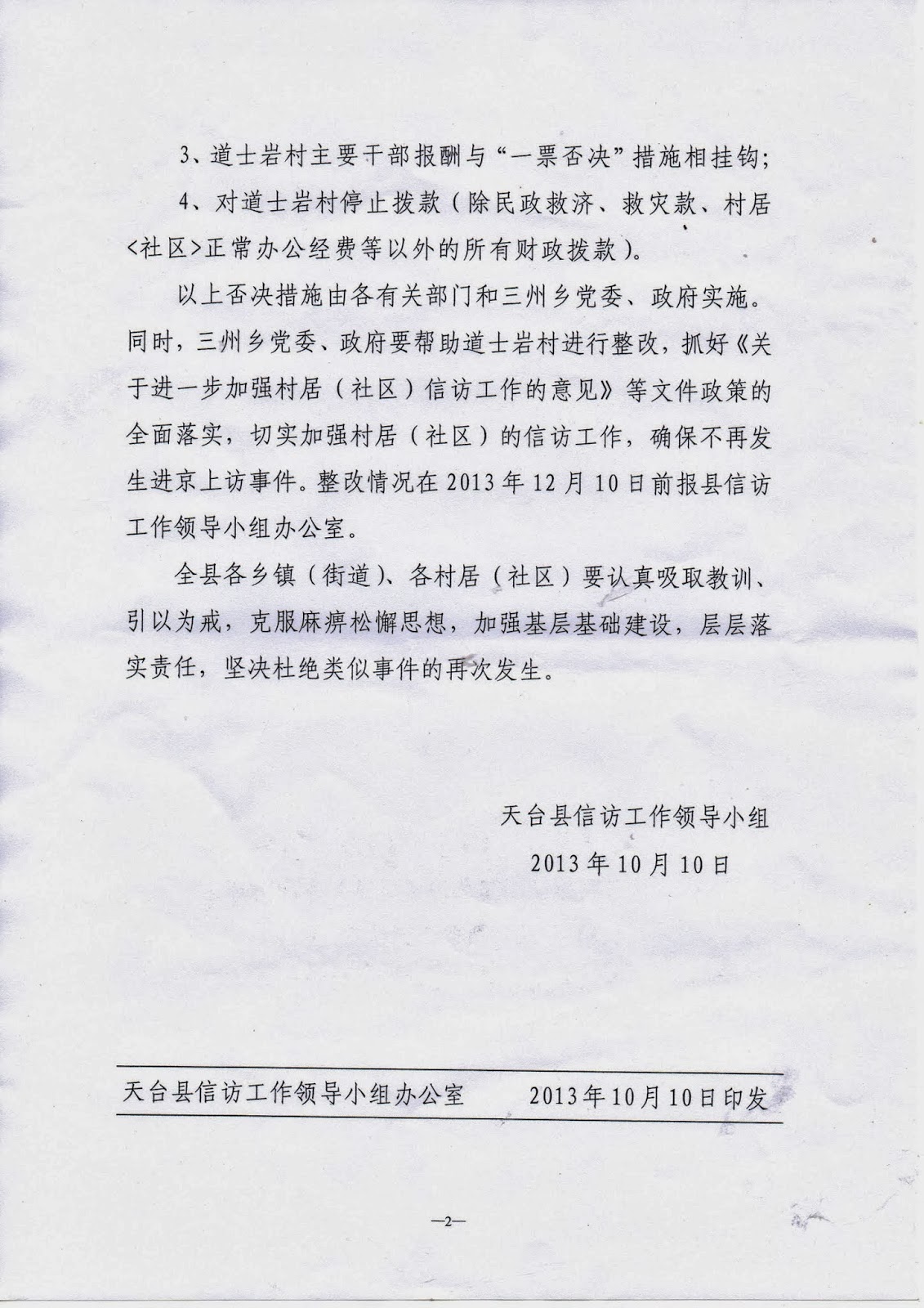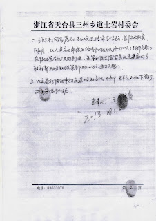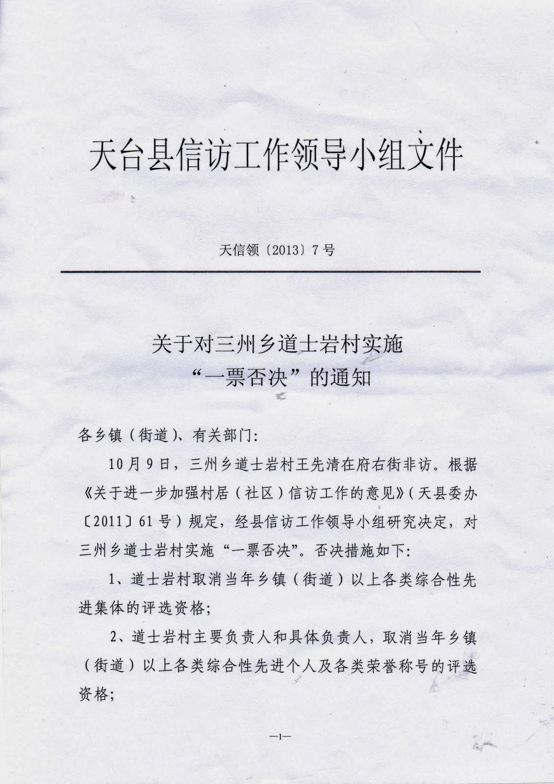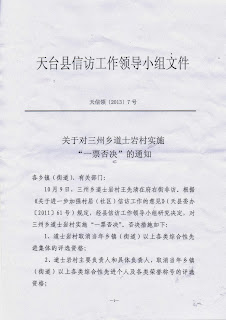 (维权网信息员黄天怒报道)浙江省天台县三州乡新岙村(现已合并到道土岩村)76岁的老农王先清为侄子伸冤和状告乡党委、乡政府及村党支部、村委会以“社会主义新农村建设”为由将他家房屋拆毁,“十一”期间到北京上访,在亮马河联合国驻华机构大楼前被北京警察抓到久敬庄,出来后又到府右街上访,被浙江驻京办和天台县截访人员押回天台。天台县政府迁怒于三州乡和道土岩村,发出了《关于对道土岩村实施一票否决的通知》(天信领【2013】7号文件),作出了“道士岩村取消当年乡镇(街道)以上各类综合性先进集体的评选资格”、“道士岩村主要负责人和具体负责人,取消当年乡镇(街道)以上各类综合性先进个人及各类荣誉称号的评选资格”、“道士岩村主要干部报酬与‘一票否决’措施相挂钩”和“对道士岩村停止拨款(除民政救济、救灾款、村居<社区>正常办公经费等以外的所有财政拨款”四项决定。