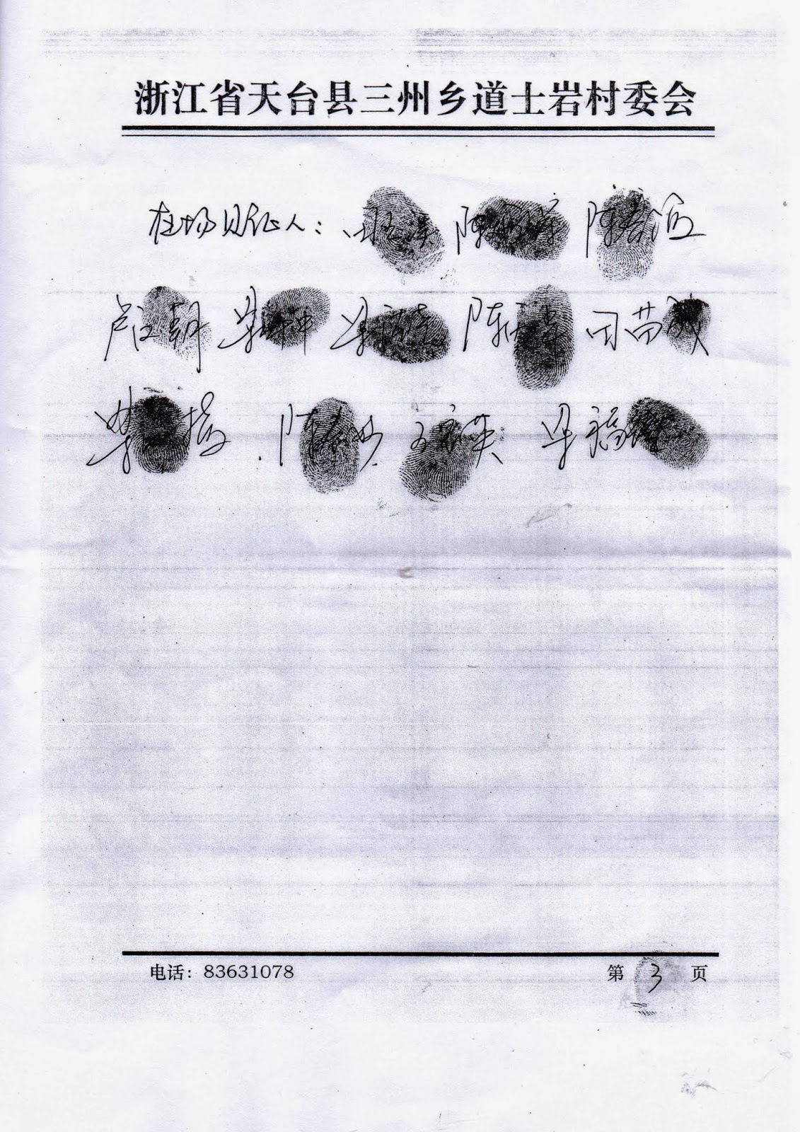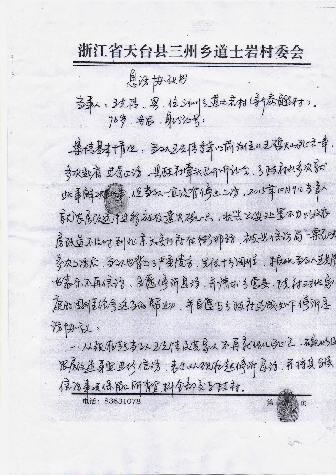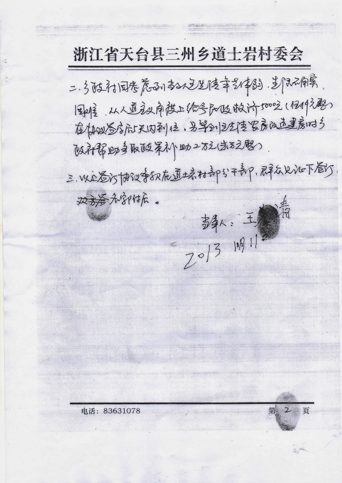 10月11日上午,三州乡政法委书记汪小云和道土岩村书记、村长把王先清老人叫到乡政府,并叫了10名所谓“村民代表”一起陪同(实际上是押送)。汪书记威胁老人说:“你一个人告状害了大家,你这样一告,上面的款就拨不下来了。你再告下去,村里人不把你打死,也要把你骂死!”接着,村书记发动“村民代表”对老人进行围攻,他们警告王先清说:你如果想在这个村住下去,就不要告了;你如果还要告,我们的房子都没得住了,那时我们就发动群众把你赶出去。王先清老人不识字(只会写自己的名字),也不会讲话,他经不起乡政法委汪书记和村书记及“村民代表”的轮番攻击,下午4点钟在汪小云写好的《息访协议》上歪歪斜斜地写上了自己的名字并按了手印。
