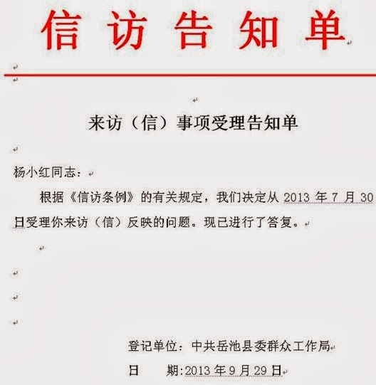 杨小红于2013年7月3日向国家信访局网站投诉四川岳池县信访局局长陈宗春和该局驻北京接访人员罗康波,绑架、殴打、非法羁押、搜身等行为,从网站时间显示2013年8月2日此投诉函转交给了四川省委镇政府信访办公室办理,8月6日8点49分转交给四川广安市委市政府信访局办理,在6日9点37分才转交给岳池县政府和信访局。而具体操办的岳池县委群众工作局在9月29日给的答复中却说“根据信访条例的有关规定,我们决定从7月30日受理你来访(信)的反映的问题,现已进行了答复”。