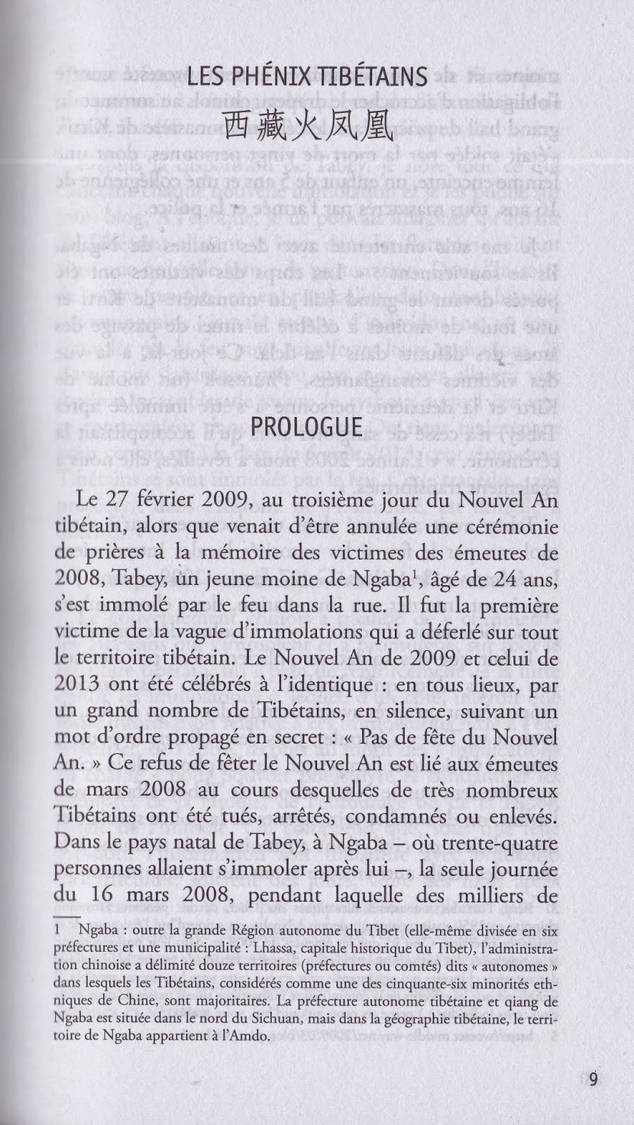 « Voici un livre dense et tragique », écrit dans sa préface Robert Badinter. Il poursuit : « Ce que les flammes qui les brûlent proclament, c’est qu’ils ne peuvent plus supporter l’agression commise contre leur peuple, l’éradication de ses coutumes et de sa langue, le génocide culturel auxquels, dans le lâche silence des États, les autorités chinoises se livrent au Tibet. »