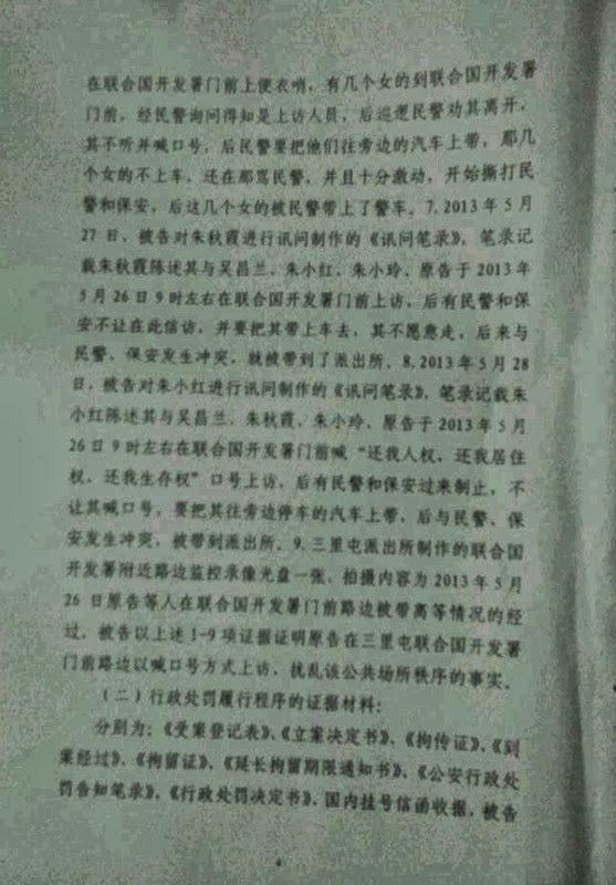 朱小平说:因强迁父亲不幸身亡。被强迁后,我们全家人无家可归。地方政府不予解决问题。我们进京上访,问题仍得不到解决。走投无路,我们全家五人到联合国开发署喊“还我人权,还我居住权,还我生存权!”的口号,全家五人除妈妈吴昌兰外,姐姐朱秋霞、朱小红、朱小玲和我都被刑拘。现在两个姐姐朱秋霞、朱小红已被判处有期徒刑五个月。