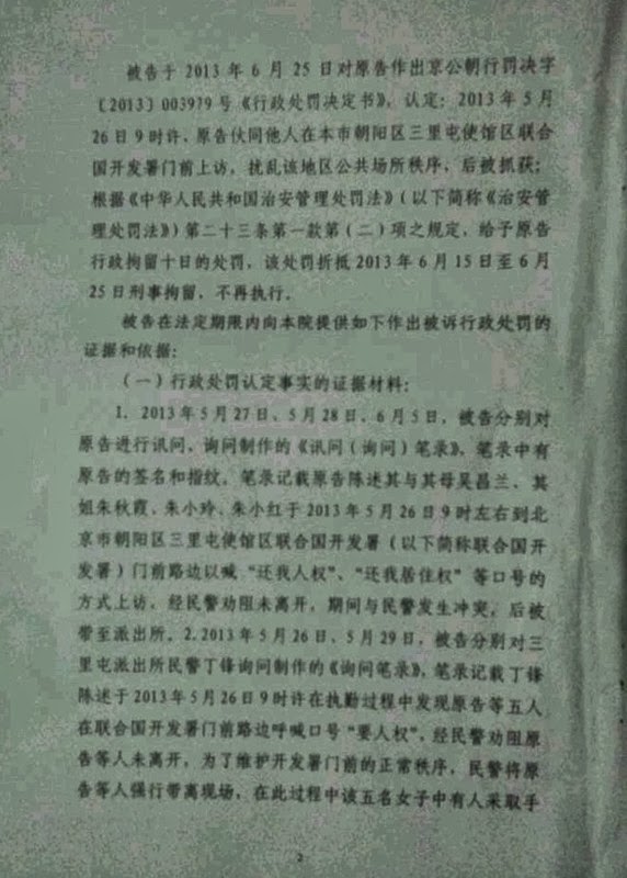 (维权网信息员田静民报道)安徽省芜湖市朱小平因强迁三年多,地方拆迁部门没给予安置,在告状无门的情况下,全家五人到北京联合国开发署喊冤,朱小萍被北京市公安局朝阳区分局以“扰乱公共秩序罪”刑事拘留30天。后改为行政拘留10天,朱小平对此不服,一纸诉状将朝阳分局告上法庭。此案于10月17日在朝阳法院开庭宣判。