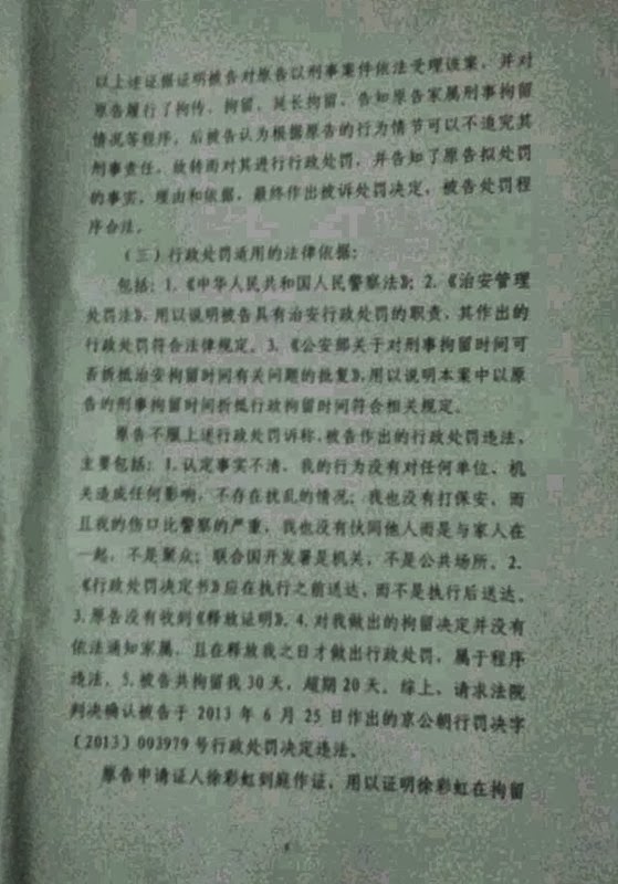 在法庭上,朱小萍陈述,自己是被以犯罪嫌疑人的身份,在看守所监禁30天,因没有犯罪事实获得释放,可释放时没有释放证。朝阳分局却把刑事拘留30天,改写成行政拘留10天,折抵刑事拘留不在执行。朱小平问有这样折抵的吗?我们被无辜超期羁押20天,对我们这20天的迫害没有人负责。而朝阳分局的证人则是利害关系人,朝阳分局向法庭提交的证据应属无效。是谁给了朝阳分局无限扩张的执法权?