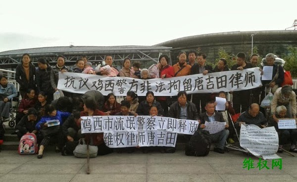 在抗议现场,有白发苍苍的老人和抱着婴儿的母亲,大家从四面八方赶来,参加抗议活动。要求鸡西市警方立即释放人权律师唐吉田,并依法保障其正常行使代理人的法定职责。