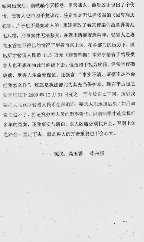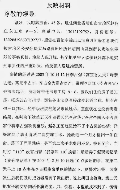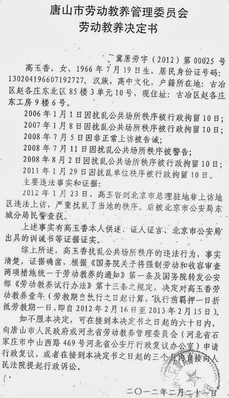 为了维护自己的信访权和人权自由权,最近高玉香一多次往返唐山-石家庄,控告当地政府非法关押、拘留、劳教上访人员,但河北省各级法院告知她,上面有通知,上访人员因拘留、劳教而提起诉讼起一律不受理。