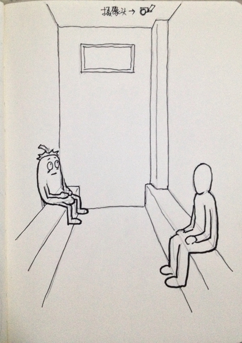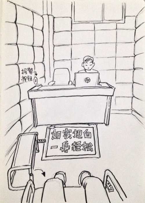- @变态辣椒:印象之一:门口的牌子写着:问询室(interrogation room)房间内四面墙都贴着海绵护墙,深枣红的皮革表面,可能是防止嫌疑人自残,但是我无聊查看门背后,发现门板上没包海绵,嗯,这里是练门了。铁椅子四脚在地面固定,左扶手用转轴连着个小桌板,合过来可以固定住,椅背90度直角,坐着不太舒服。