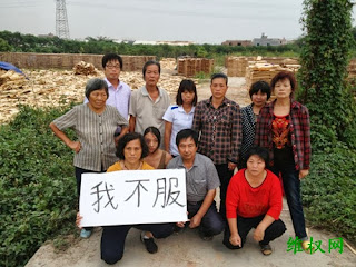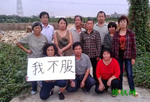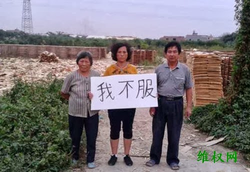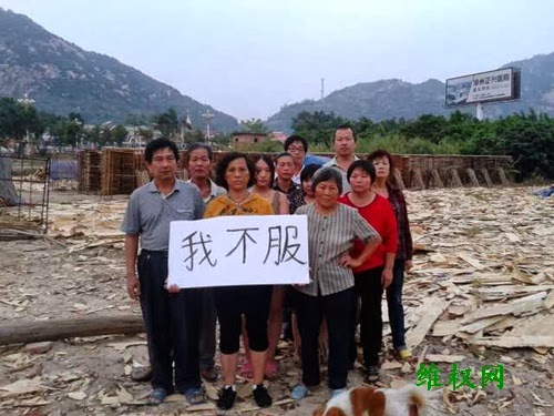 (维权网信息员林仙报道)福建省龙海市榜山镇梧浦村女冤民李红花及其家人和专程从福州前来声援的张秀屏、陈茂妹、庄磊、唐兆星、石立琴、林苗捷等冤民,在被镇、村干部非法暴力拆迁的李红花原生产毛木耳场所等地,打出上写“我不服”的条幅,强烈控诉当地官员、警察侵犯人权的违法事实。