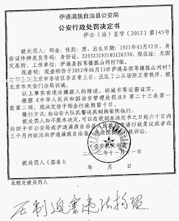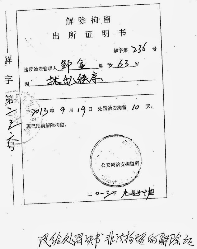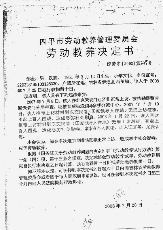 今年9月18日,去府右街邮局寄信的邹金又被地方政府人员截走,当天就押回伊通县,以“扰乱秩序”为由行政拘留十天。