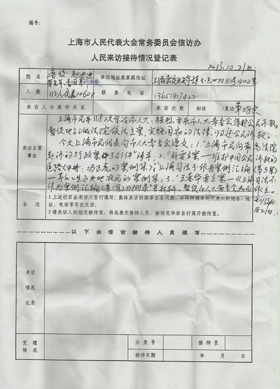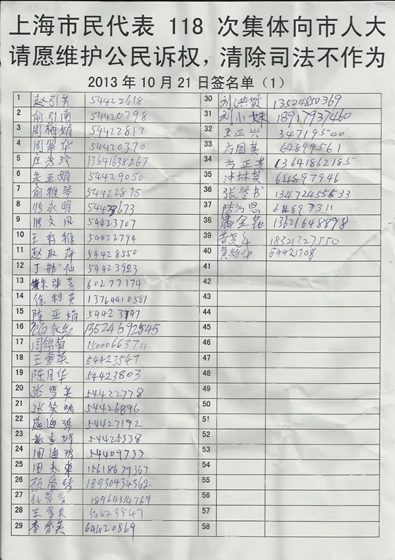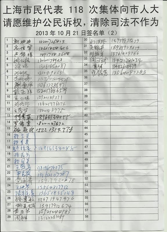 2013年10月21日下午,114名上海市民第118次集体上访上海市人大常委会人民来访接待室。请求上海市人大常委会履行督促法律实施的责任,捍卫法律,维护公民诉权,督促地方法院依法立案,清除司法不作为恶习。