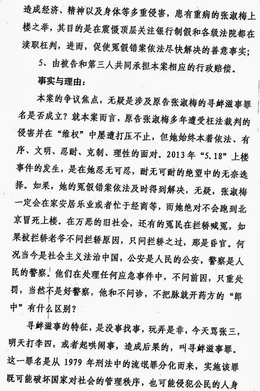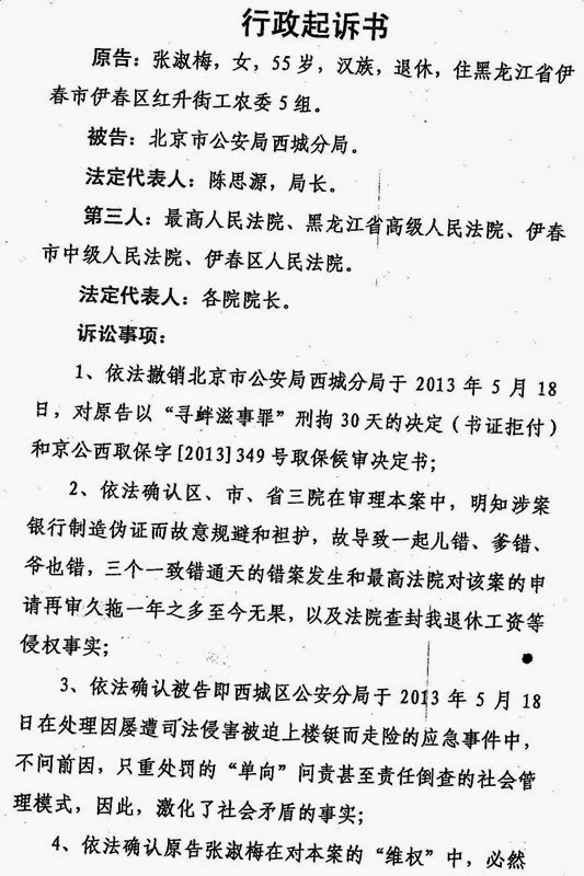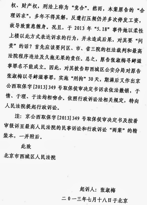 张淑梅认为作为一个55岁的女人她没有能力去寻什么衅,北京警方对她刑拘30天纯粹是欲加之罪,她更不想把犯罪嫌疑人的称号背一年,因而提起行政诉讼,状告北京市公安局西城分局。请示依法撤销对她“因寻衅滋事刑事拘留30天”的错误决定和依法撤销对她“取保候审”的错误决定。
