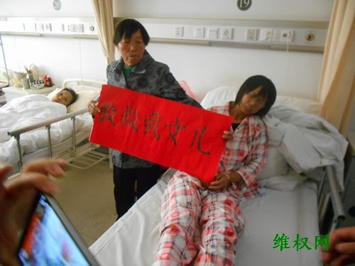 (维权网信息员徐熙源)2013年10月26日,郑州贾灵敏、长沙罗宾汉、南京许娟、济南倪文华、北京志愿者、南通单丽华、常熟顾晓峰、如皋季竹芳以及当地的维权人士王小俐、张慧玲等人,陆续来到常州市中医医院看望患肺癌的蒋雪华。大家纷纷为蒋雪华捐款。特别引人注目的是,常州著名的维权人士张建平,身患残疾,也坐着轮椅来看望蒋雪华。