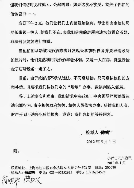 (维权网信息员宗世石报道)访民陈红飞、翁明华是浙江省舟山市人,他们夫妻为八户渔民的房屋被政府野蛮强拆得不到合理的安置,作为八户渔民的代表来北京上访已近10年。十年来他们数百次去国家信访局登记交表,因为4号窗口是接待强拆和违规征地的,所以很多年他们夫妻都是在4号窗口登记。