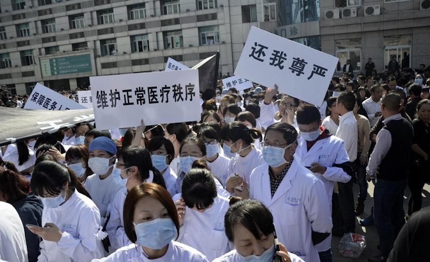 - 10月28日上午,浙江温岭市第一人民医院内,数百名来自温岭医疗系统的医务人员一边喊着院长下台,一边举着医疗暴力“零容忍”、维护正常医疗秩序等牌子举行抗议。呼吁当地市政府领导关注医护人员人生安全,杜绝医院内出现医疗暴力。