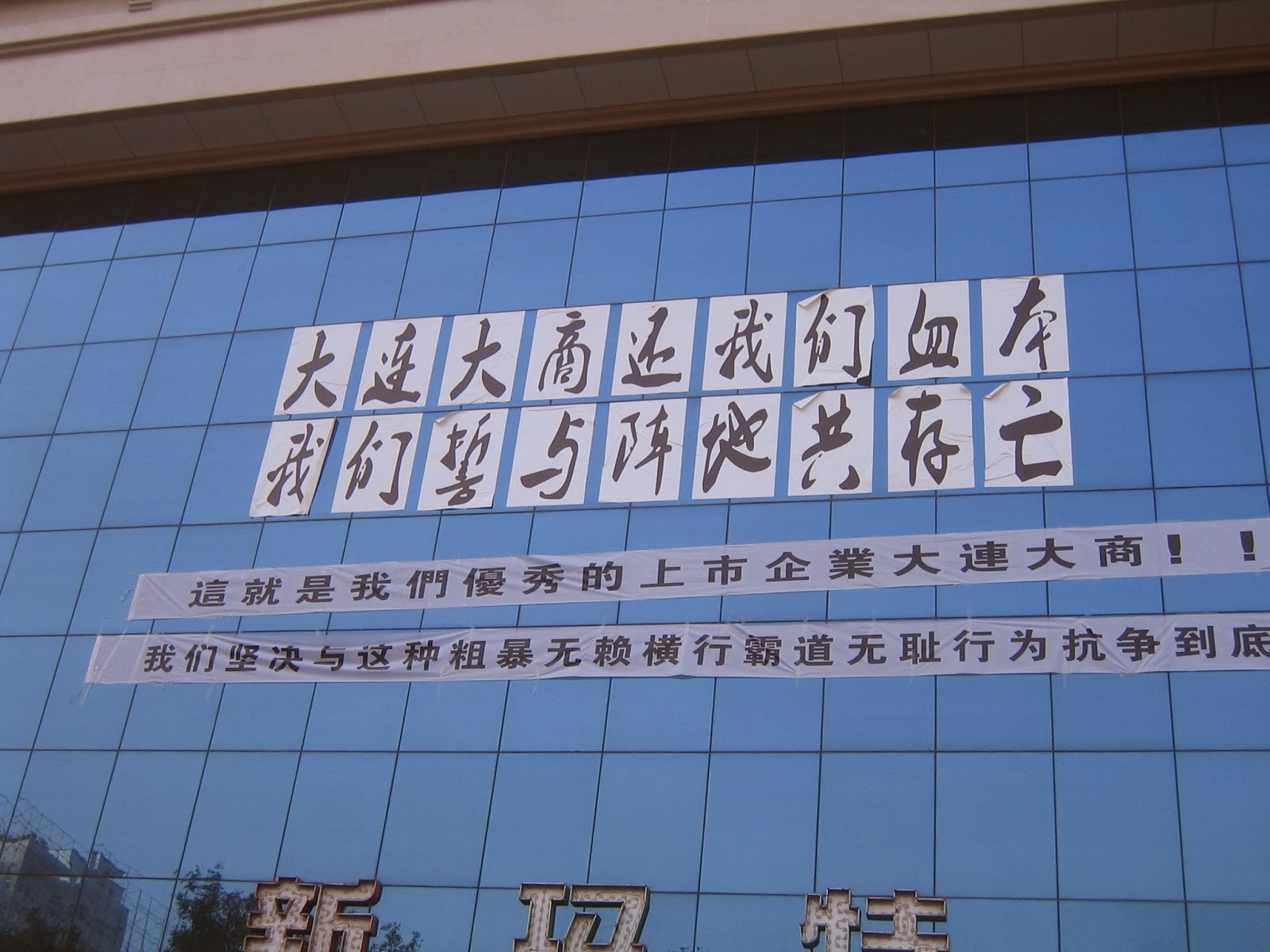 然而,我们经营了只有三年多时间, 大商西安商贸就突然毫不告知原由地单方面要求我们商户撤出。 我们向大商西安商贸质询,答复也没有任何能站得住脚的理由。 在强令我们商户撤出的同时, 大商西安商贸还非法解雇了四五百雇佣的员工, 欠发这些员工三个月的工资,欠交两年的养老、住房等基金。 这些员工追讨无果,在9月30日, 曾封堵了的新玛特购物广场前的解放路。