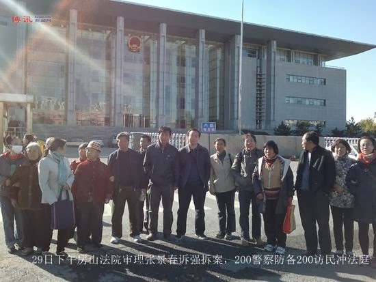 喻懋莲、张憬民、张憬川母子三人被控涉嫌“妨害公务罪”一案的审理,受到各地上访维权人士特别是强拆受害者的关注,有近两百名维权人士到房山法院围观,希望参加旁听,而近两百名警察及便衣也同时在现场监控。