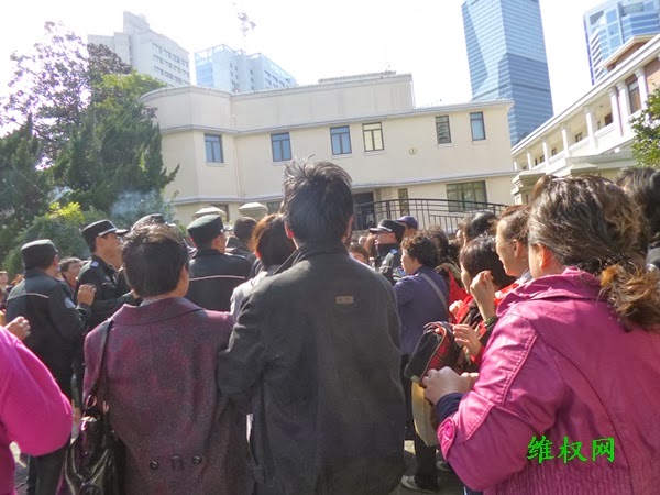 (维权网信息员子夕报道)28日下午,数十名上海维权代表到位于江苏路888号长宁区党校,要求中央督导组调查沈勇死因真相。代表之一的孔令珍表示自己看见被警察打死的沈勇浑身是伤,10多个警察从党校里冲出来,将她按倒在地抓走,后来获悉她已被行政拘留。