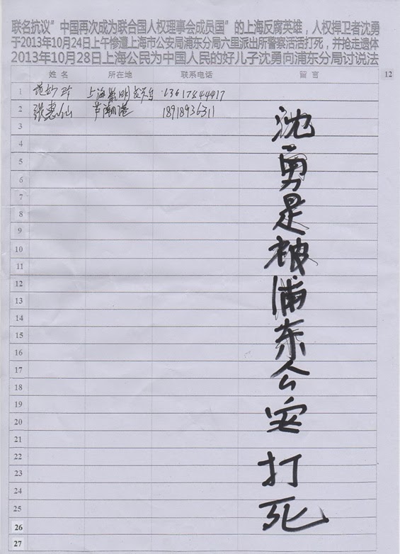 10月21日,沈勇还与上海217名公民一起,联名反对中国再次成为联合国人权理事会成员国。联名抗议中希望,请联合国各成员国(尤其是民主国家)信守《世界人权宣言》和国际人权公约,不要让联合国普遍定期审议中国成为蚕食联合国国际人权机制和降低国际人权标准的机会,国际人权标准的丧失,是整个人类的灾难。不料,仅仅过了三天,沈勇即惨遭横死。