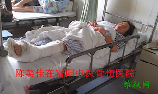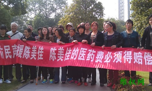 (维权网信息员尉迟惩恶报道)杭州维权人士陈美佳今年6月6日晚,在北京马家楼被她所在的江干区政府、彭埠镇政府及普福社区派出的截访人员从北京押回,6月7日途经山东济南时,在上厕所的过程中,被截访人员推倒,导致左腿粉碎性骨折。10月30日,一百多位访民到杭州市政府请愿,要求市政府责令江干区政府、彭埠镇政府和普福社区赔偿陈美佳的全部医疗费用。