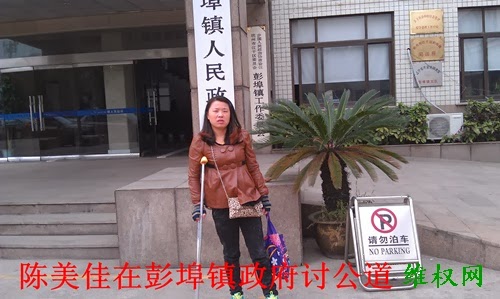 陈美佳是因非法强拆被迫到北京上访的。几年来不仅问题没有得解决,反而越积越多,曾多次被抓被关被打,去年中共十八大召开前后被关在黑监狱达两个多月。现陈美佳家里生活异常困难,因村里和镇里拒不赔偿,陈美佳只好委屈求全,改为向村里借钱以渡过难关,村里虽然没有明显拒绝,但也遭到诸多刁难。