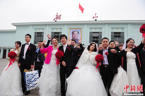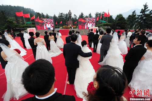 11月10日,百名新人集体乘坐“韶山一号”列车来到红色圣地韶山,参加“2013中国(韶山)红色集体婚礼”,在毛泽东铜像前许下“拒绝婚姻随意化”的誓言。被誉为“中国第一幸福伉俪”(编辑注:原文如此)的蒋含宇、彭淑清夫妇这样祝福参加集体婚礼的50对新人:“我相信,在毛主席的见证下,你们一定会幸福。”