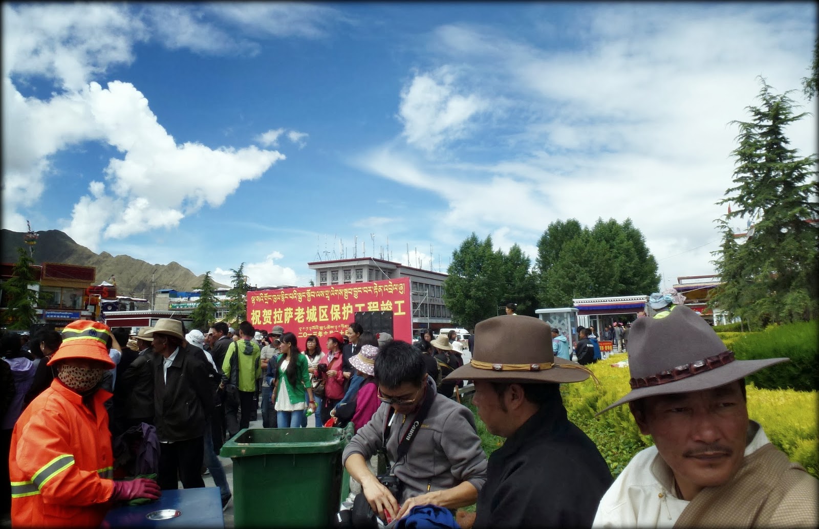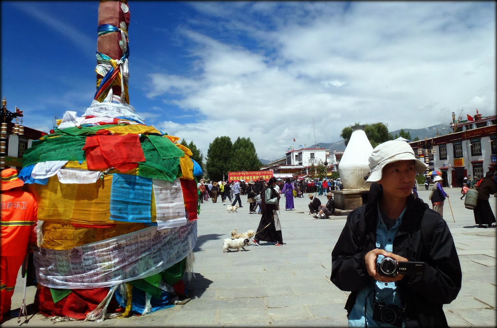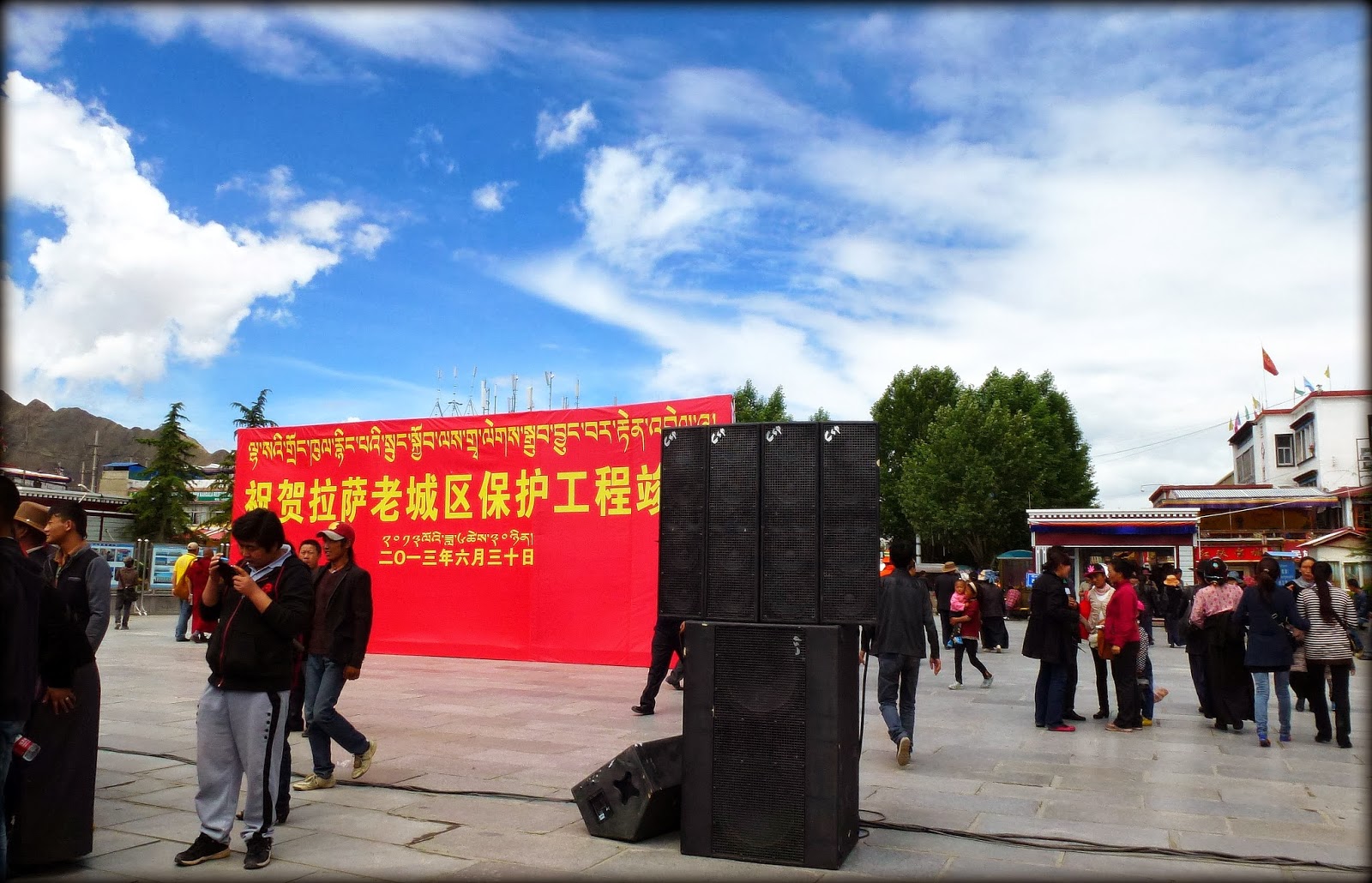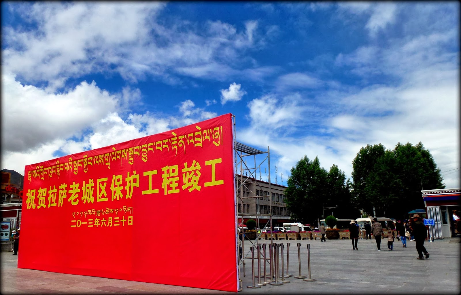 当我和一起到拉萨的独立电影人朱日坤,通过了设置在大昭寺广场上的安检门之后,见到了一幅精心安排的庆祝场景,原来正是在“祝贺拉萨老城保护工程竣工”,实在很巧。
