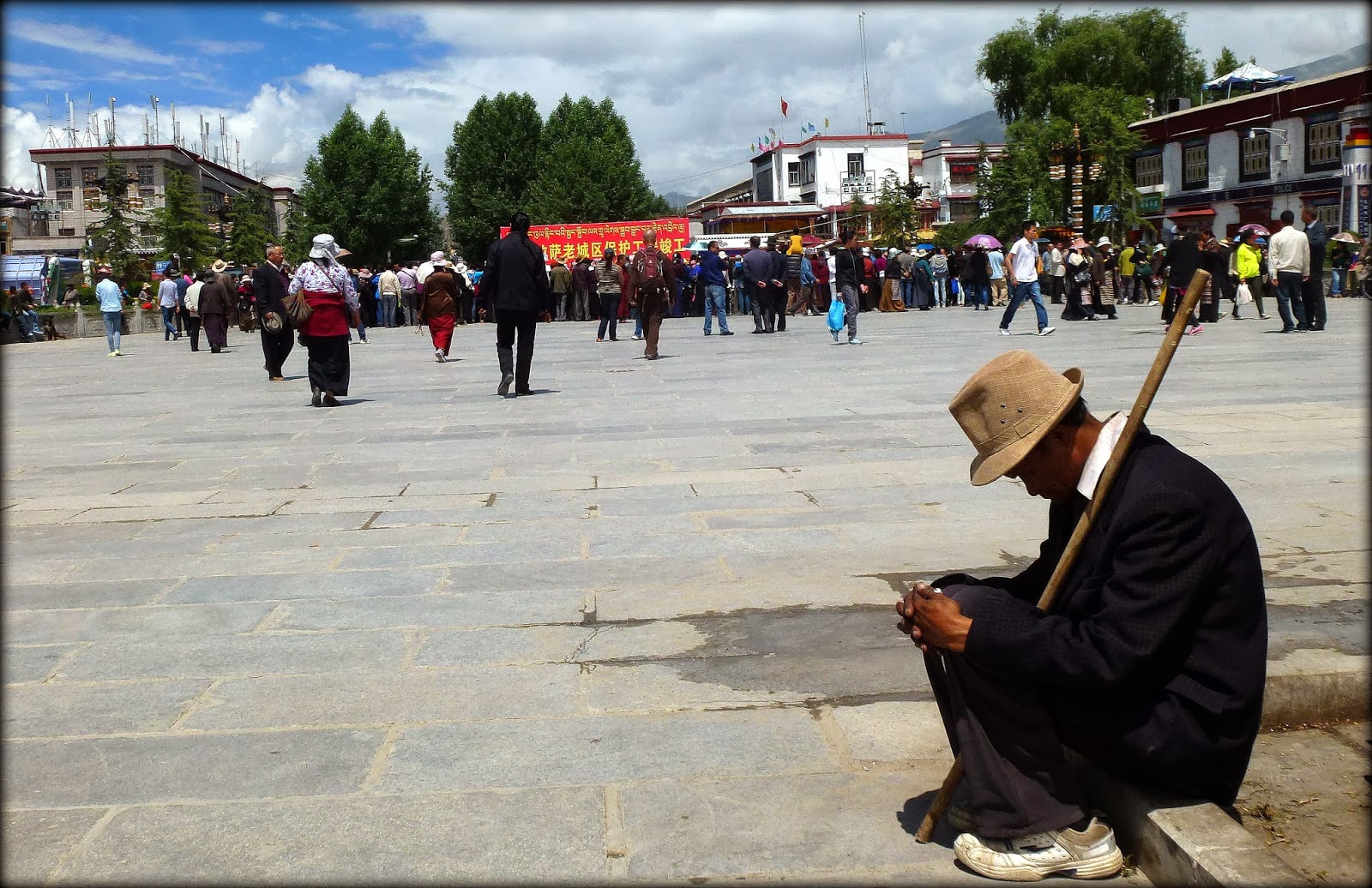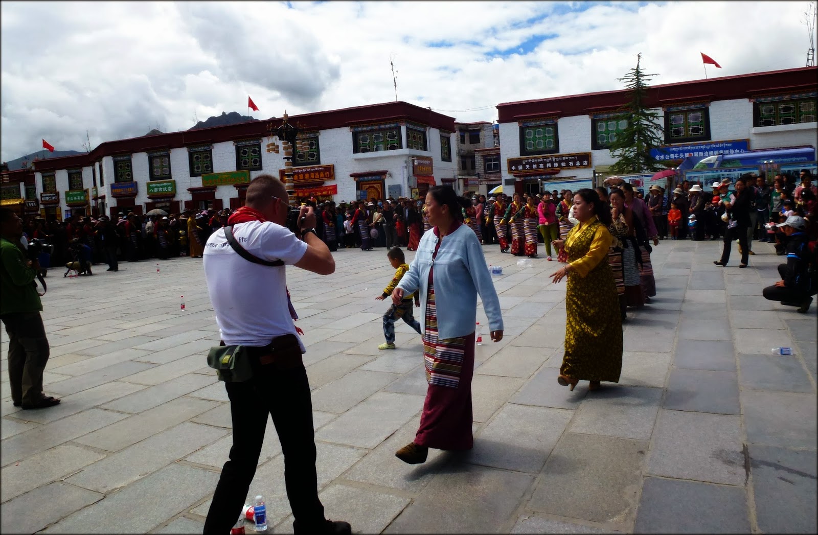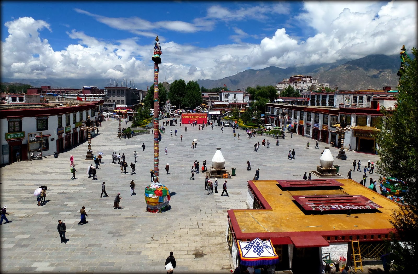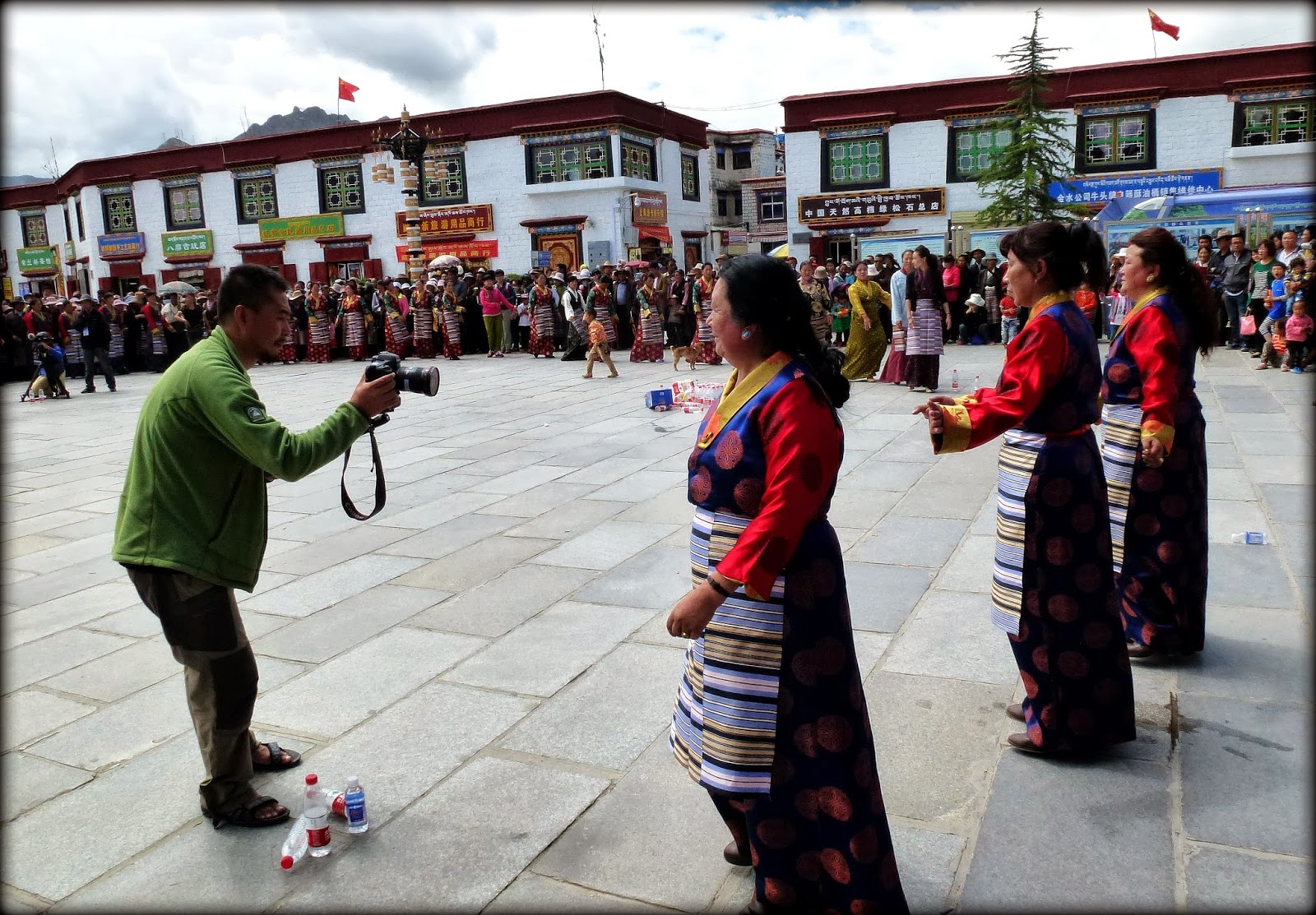 当我和一起到拉萨的独立电影人朱日坤,通过了设置在大昭寺广场上的安检门之后,见到了一幅精心安排的庆祝场景,原来正是在“祝贺拉萨老城保护工程竣工”,实在很巧。